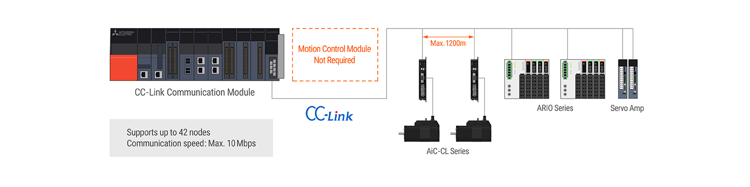 The AiC-CL series Ai-SERVO motors feature support for CC-Link communication. The motors can be used with Mitsubishi PLCs through CC-Link communication, offering easy connection, installation, and control without additional modules or controllers. Up to 42 axes can be controlled simultaneously or independently.