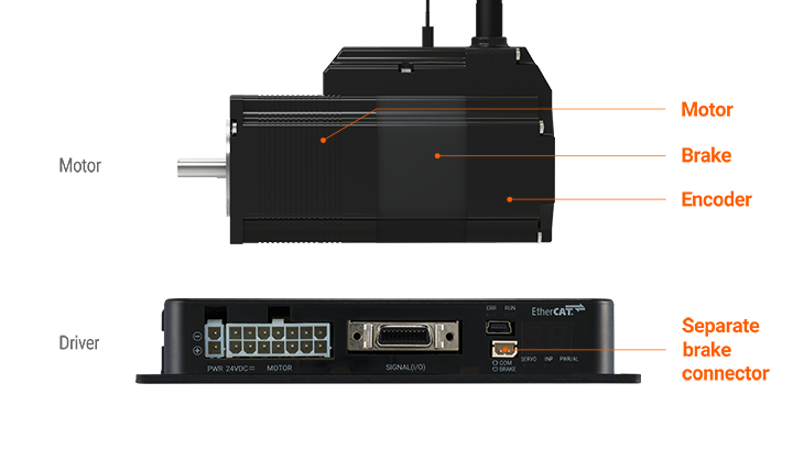 The built-in brake type motor and drivers allow stable control of vertical loads. The brakes are located towards the rear and the separate brake connector allows easy connection.