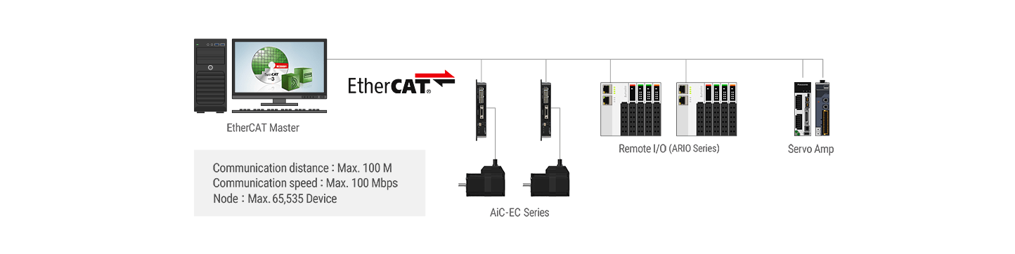 The AiC-EC series motor system can control motion of multiple axes simultaneously with 100 Mbps communication speed through EtherCAT. The motor system has completed the conformity test by EtherCAT Technology Group to ensure high compatibility between primary and secondary devices.