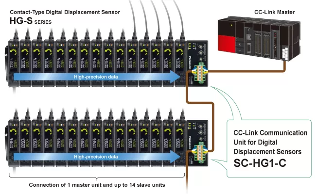 SC-HG1-C | Can directly send high-precision measurement values to CC-Link Master. • Communication method Switchable CC-Link Ver.1.10 or 2.00 • Number of occupied station CC-Link Ver.1.10: 4 stations, CC-Link Ver.2.00: Switchable 2 or 4 stations • Number of connected units Controllers: Maximum of 15 units (1 master, 14 slaves) per SC-HG1-C unit |