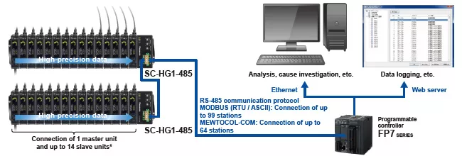SC-HG1-485 | Can directly send high-precision measurement values by RS-485 communication • Communication protocol MODBUS (RTU / ASCII) / MEWTOCOL-COM • Number of connected units Host (RS-485): 1 to 99 units when MODBUS (RTU / ASCII) is used, 1 to 64 units when MEWTOCOL-COM is used Controllers: Maximum of 15 units (1 master, 14 slaves) per SC-HG1-485 unit |