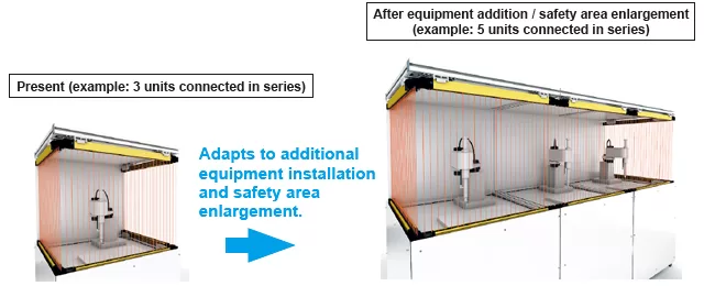 Up to five units (1 main sensor and 4 sub-sensors) can be connected in series, and the maximum number of beams has been increased to 256. This provides extra convenience when installing additional equipment, when increasing the detection width (protection height), and when using one system for protection of multiple locations.