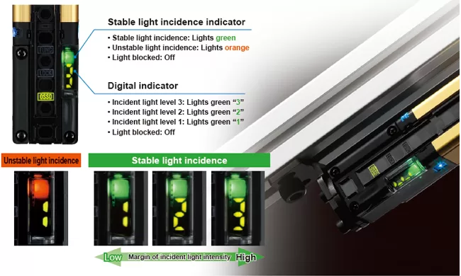 The stable light incidence indicator is commonly used when installing a new safety light curtain to equipment or when checking if the existing safety light curtain is operating properly. Previously, however, even if the stable light incidence indicator was ON, there was no way of knowing whether there was an ample margin or the condition is close to unstable light incidence.