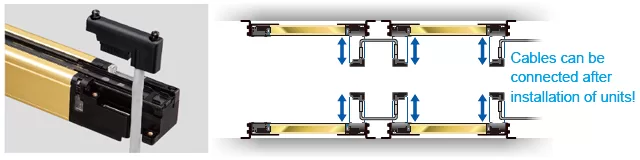 Uses the well-received front access cable of previous models. The cable can be attached and detached after the safety light curtain is installed on the equipment. This allows easy replacement in the event that the cable is damaged.