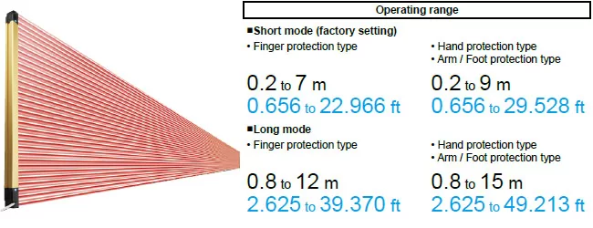 * The aperture angle of a Type 4 safety light curtain is specified as a maximum of 2.5° each on the right and left at a detection distance of 3 m 9.843 ft or more.