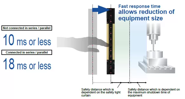 The OFF response time of the control outputs (OSSD 1, OSSD 2) of the SF4D series is 10 ms or less (when not connected in series or in parallel).