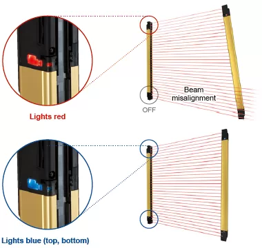 The color of the indicator notifies whether the beam axes of both top and bottom ends are aligned properly. The indicator is easy to see from any direction so mistakes can be prevented in a long-distance setup.