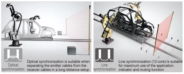 When choosing and installing a safety light curtain, the synchronization method and cable can be selected flexibly according to the customer’s specific application and needs, such as the basic configuration or safety-enhanced configuration with improved operability.