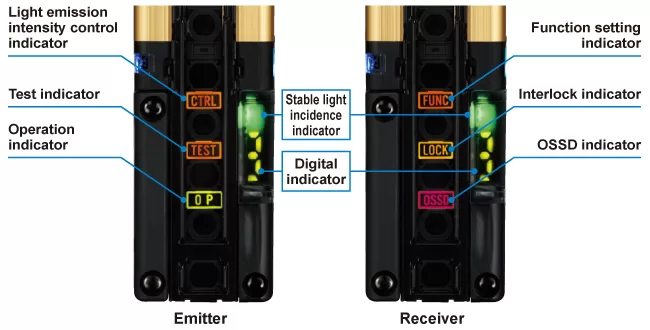 The indicators show stable light incidence status and notify various conditions. The OSSD indicator, interlock indicator and function setting indicator are arranged between the beam axes for easy visibility.