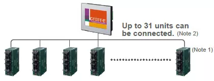 Up to 31 PLC units can be connected to one GT unit. Progress in multiple production lines can be centrally monitored and controlled via one GT unit.
