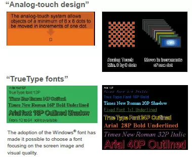 GT series displays use an analog-touch panel where locations of parts and characters can be adjusted in increments of one dot. The adoption of the Windows® font has widened the character size selection (10 to 240 dots), making the screen design more flexible.