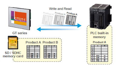 For high-mix production, recipe data up to 64 types and 4,096 devices in total, can be easily set on a PC. The created recipe data is saved on an SD / SDHC memory card, and the specified data can be written or read from a PLC.