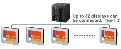 Up to 32 GT displays can be connected to one PLC unit without communication programs. The same screen operation is possible at a conveyor line or other remote locations, and the number of PLC units can be reduced, cutting the production process costs.