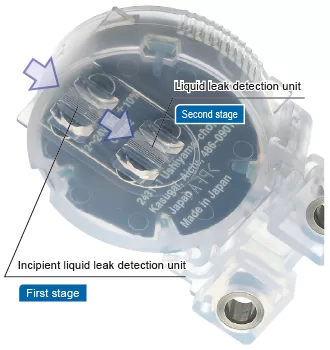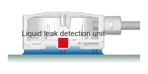 On the bottom of the sensor are two detection units, one located at the front and one at the center. If a liquid leak occurs in front of the sensor, the front detection unit will detect even a small incipient leak. When the leak increases in volume and reaches the center of the sensor, it will be detected as an abnormal leak.