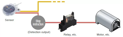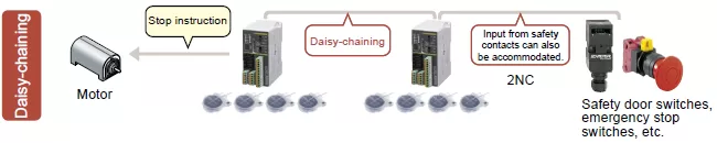 The controller’s safety input function can be used to connect wiring used to daisy-chain controllers together as well as input from safety contacts (2NC) on emergency stop switches, safety door switches, and other devices. In this way, safety output can be aggregated onto a single line to reduce safety circuit wiring and lower costs.