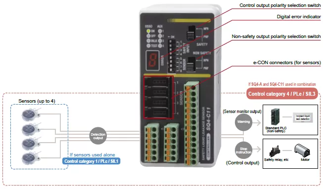 SQ4-C11 | Up to 4 safety liquid leak sensors can be connected. Control Category 4, PLe, SIL3 |