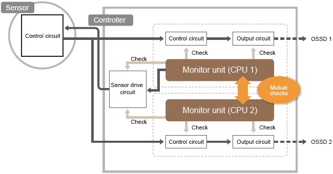 The controller’s two independent CPUs mutually check the unit’s operating state, and redundant signal processing and output circuits ensure safety.