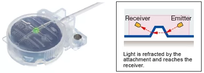 In the absence of a leak, the receiver is able to detect the light from the emitter. When a leak occurs, the light is diffused by the liquid.